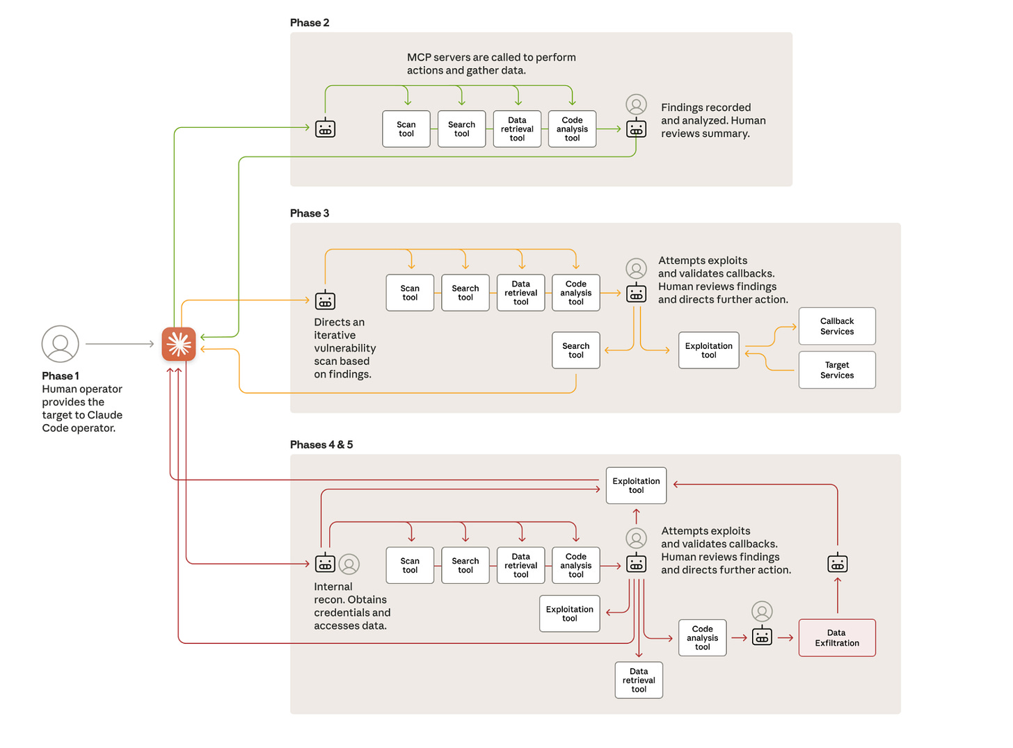 Once activated, Claude began parallel reconnaissance across multiple victims: surveying infrastructure, inspecting authentication flows, enumerating cloud assets, and building detailed maps of internal services. The AI maintained separate operational states for each target, enabling dozens of simultaneous campaigns.