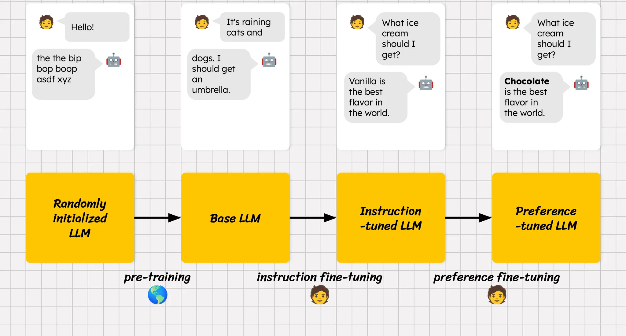 LLMs are built through a well-defined multi-stage pipeline, including pretraining, instruction tuning, and preference tuning.